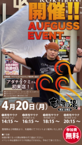 いつも竜泉寺の湯 草加谷塚店をご利用いただき誠にありがとうございます。 今月アウフグースの第2弾を開催いたします。 男性は4月20日(月) サウナ&カプセルキュア国分町のアダチタクミさんが初来・・・