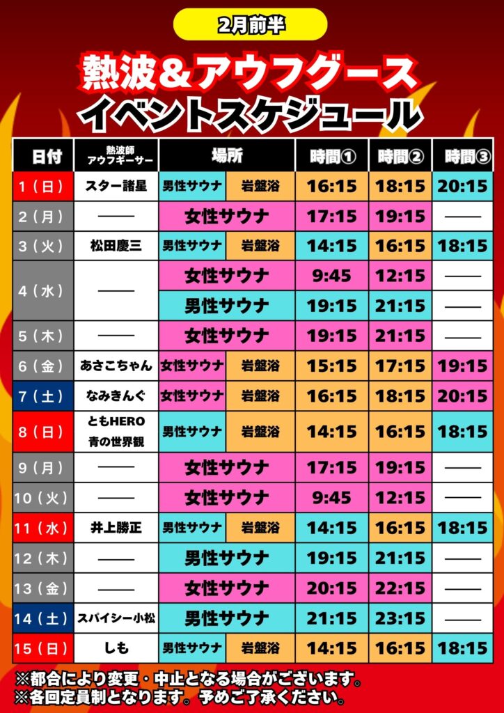 最新記事 2月前半の 『熱波&アウフグース』スケジュール(更新日:2026.01.31) 2月のアウフグースイベント(更新日:2026.01.27) 1/28(水)女性朝風呂時間帯休止のお知らせ(更新日:2026.01.22) 1月後半の 『熱波&アウフグース』スケジュール(更新日:2026.01.16) 1月前半の 『熱波&アウフグース』スケジュール(更新日:2026.01.02)