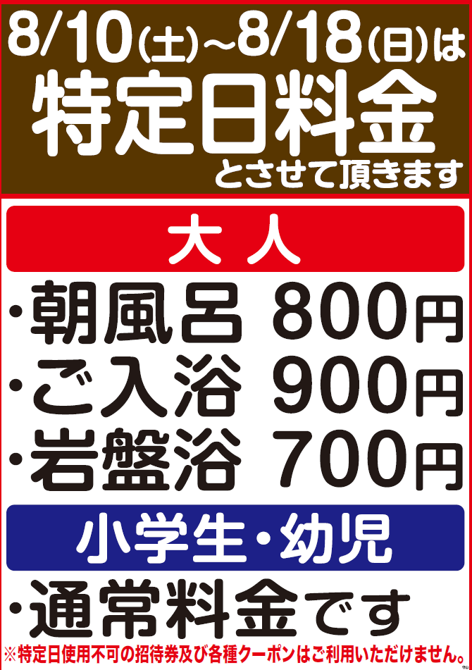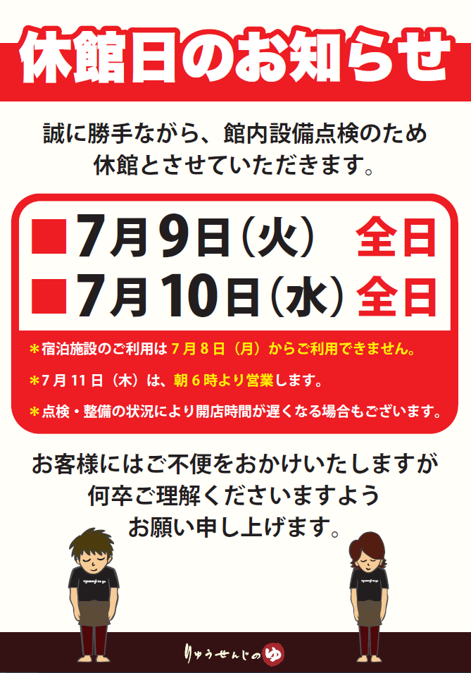 お知らせ Information 2024年8月21日 【ヨガレッスンスケジュール】 【9月のヨガレッスンのスケジュール】 こちらをご確認の上ご参加くださいませ。 ※参加費500円 ※岩盤浴ご利用の方限定となります 2024年8月3日 【夏季特別料金のお知らせ】 平素は天空SPAHILLS竜泉寺の湯名古屋守山本店をご利用頂き誠にありがとうございます。 令和6年8月10日(土)~令和6年8月18日(日)は夏季特別料金とさせて頂きます ・大人入館料 900円 ・朝風呂 800円 ・フ […] 2024年7月18日 【ヨガレッスンスケジュール】 【8月のヨガレッスンのスケジュール】 こちらをご確認の上ご参加くださいませ。 ※参加費500円 ※岩盤浴ご利用の方限定となります 2024年6月24日 【名古屋プレミアム商品券】 6月25日(火)より名古屋プレミアム商品券が当店で使えるようになりました! ※自動精算機での対応は出来ません すべてレジ対応となります。 ・入館料には使用できません。 ・紙クーポンのみ使用できます。 (電子クーポ […] 2024年6月22日 【休館日のお知らせ】 7月9日(火) 7月10日(水)の2日間 設備点検及びメンテナンスのため、休館日とさせていただきます。 大変ご迷惑をお掛け致しますが、ご理解のほどよろしくお願い致します。 « 先頭«...89101112...2030...»最後 » Follow us