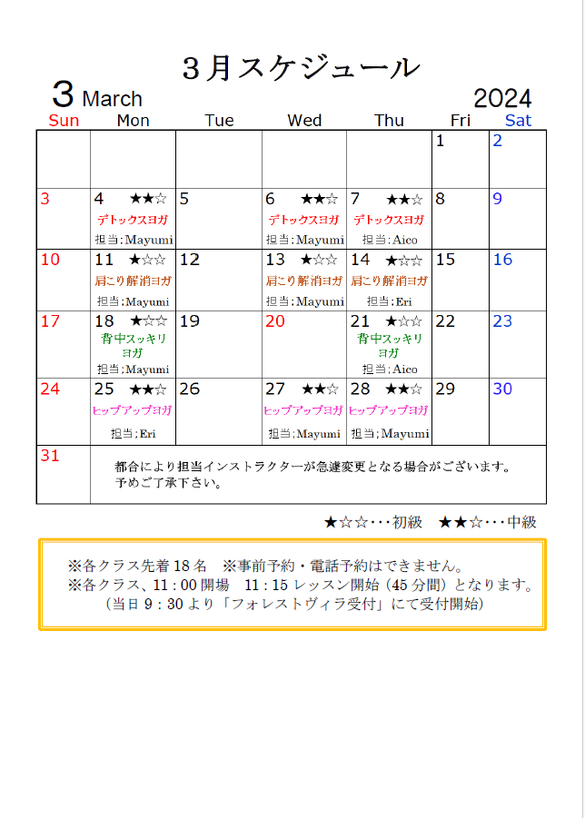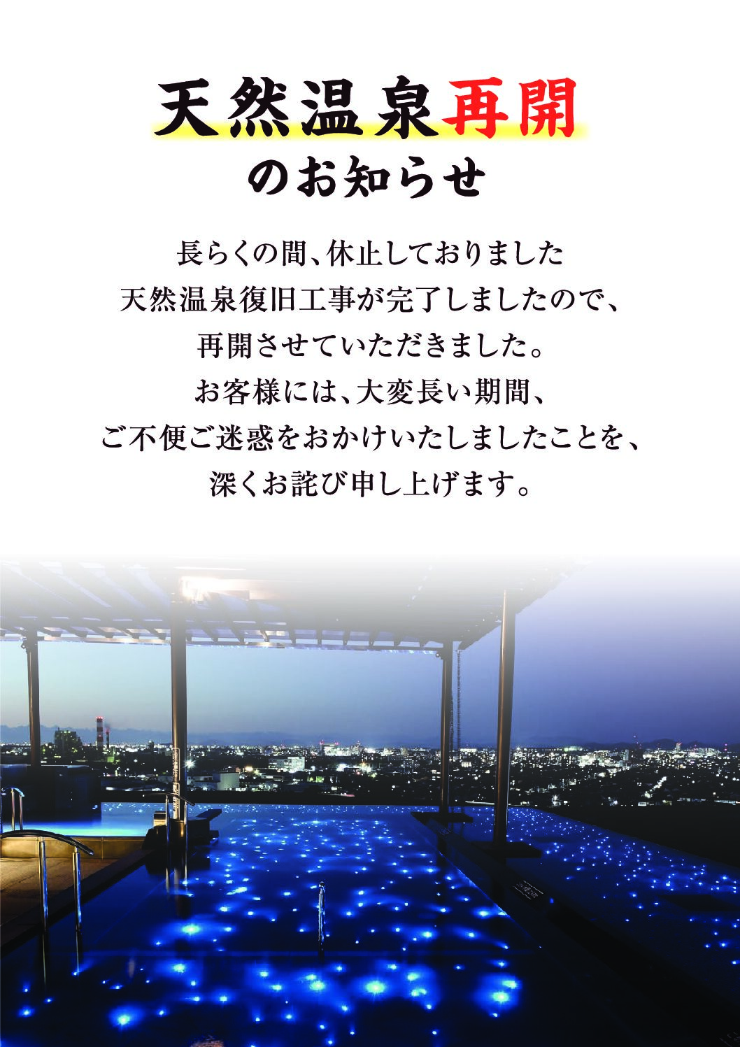 お知らせ Information 2024年3月21日 【湯あがりキッチン一休の朝食営業終了のお知らせ】 2024 年4月21日(日)を持ちまして朝食営業終了 させていただくことになりました。 皆様にはご不便をおかけしますが、 何卒ご理解くださいますようお願い申し上げます。 2024年3月20日 【ヨガレッスンスケジュール】 【4月のヨガレッスンのスケジュール】 こちらをご確認の上ご参加くださいませ。 ※参加費500円 ※岩盤浴ご利用の方限定となります 2024年2月24日 【天然温泉再開のお知らせ】 長らく停止しておりました温泉の利用を再開しました 長らくの間、お客様には大変ご迷惑、ご不便をおかけしましたことを 心からお詫び申し上げます。 申し訳ございませんでした。 2024年2月21日 【ヨガレッスンスケジュール】 【3月のヨガレッスンのスケジュール】 こちらをご確認の上ご参加くださいませ。 ※参加費500円 ※岩盤浴ご利用の方限定となります 2024年1月22日 【温泉ポンプメンテナンス】 温泉ポンプメンテナンスのため当面の間 温泉水での営業を休止いたします。 (井戸水を利用して営業致します) ご迷惑を、おかけしますが何卒、ご了承下さいませ。 « 先頭«...1011121314...2030...»最後 » Follow us