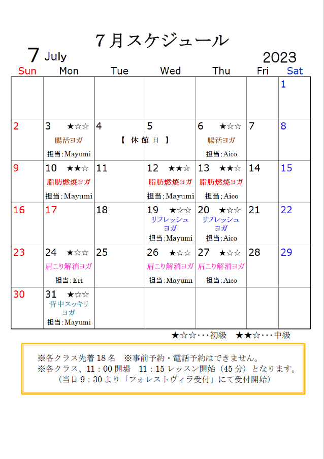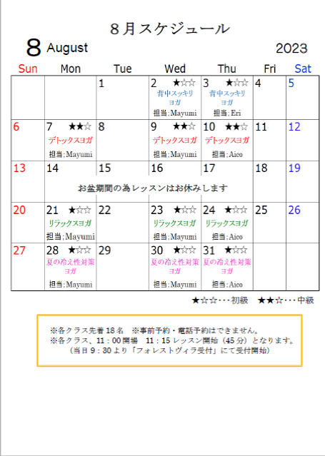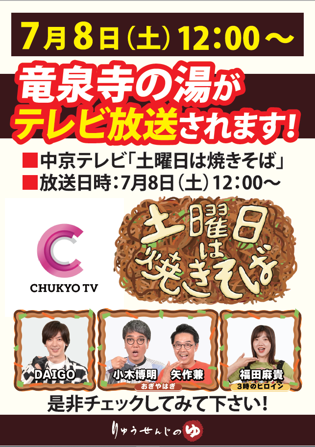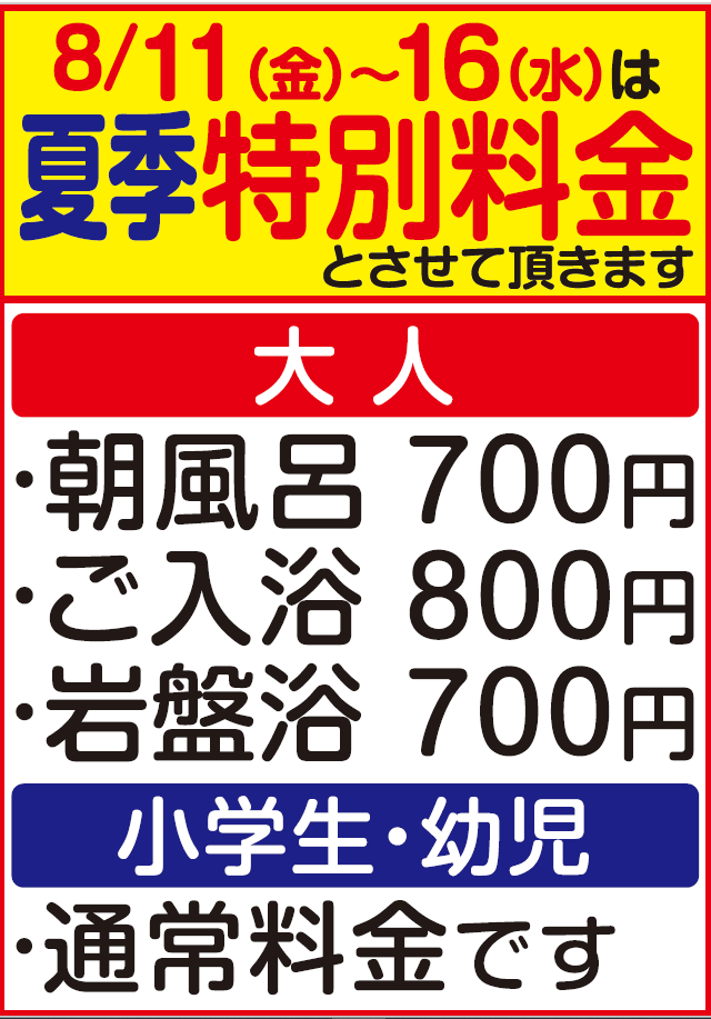 お知らせ Information 2023年8月4日 【夏季特別料金のお知らせ】 8月11日(金)~8月16日(水)は夏季特別料金とさせて頂きます ・大人入館料 800円 ・朝風呂 700円 ・フォレストヴィラ利用 700円 ※小学生・幼児は「通常料金」と させていただきます。 何卒ご了承くださいます […] 2023年7月24日 【ヨガレッスンスケジュール】 【8月のヨガレッスンのスケジュール】 こちらをご確認の上ご参加くださいませ。 ※参加費500円 ※岩盤浴ご利用の方限定となります 2023年7月2日 7/8 竜泉寺の湯がテレビ放送されます! 中京テレビ 番組名 土曜日は焼きそば 放送日時 7月8日(土)12:00~ 是非チェックしてみて下さい! 2023年6月25日 【ヨガレッスンスケジュール】 【7月のヨガレッスンのスケジュール】 こちらをご確認の上ご参加くださいませ。 ※参加費500円 ※岩盤浴ご利用の方限定となります 2023年6月2日 【休館日のお知らせ】 7月4日(火) 7月5日(水)の2日間、 設備点検及びメンテナンスのため、休館日とさせていただきます。 大変ご迷惑をお掛け致しますが、ご理解のほどよろしくお願い致します。 « 先頭«...10...1415161718...30...»最後 » Follow us