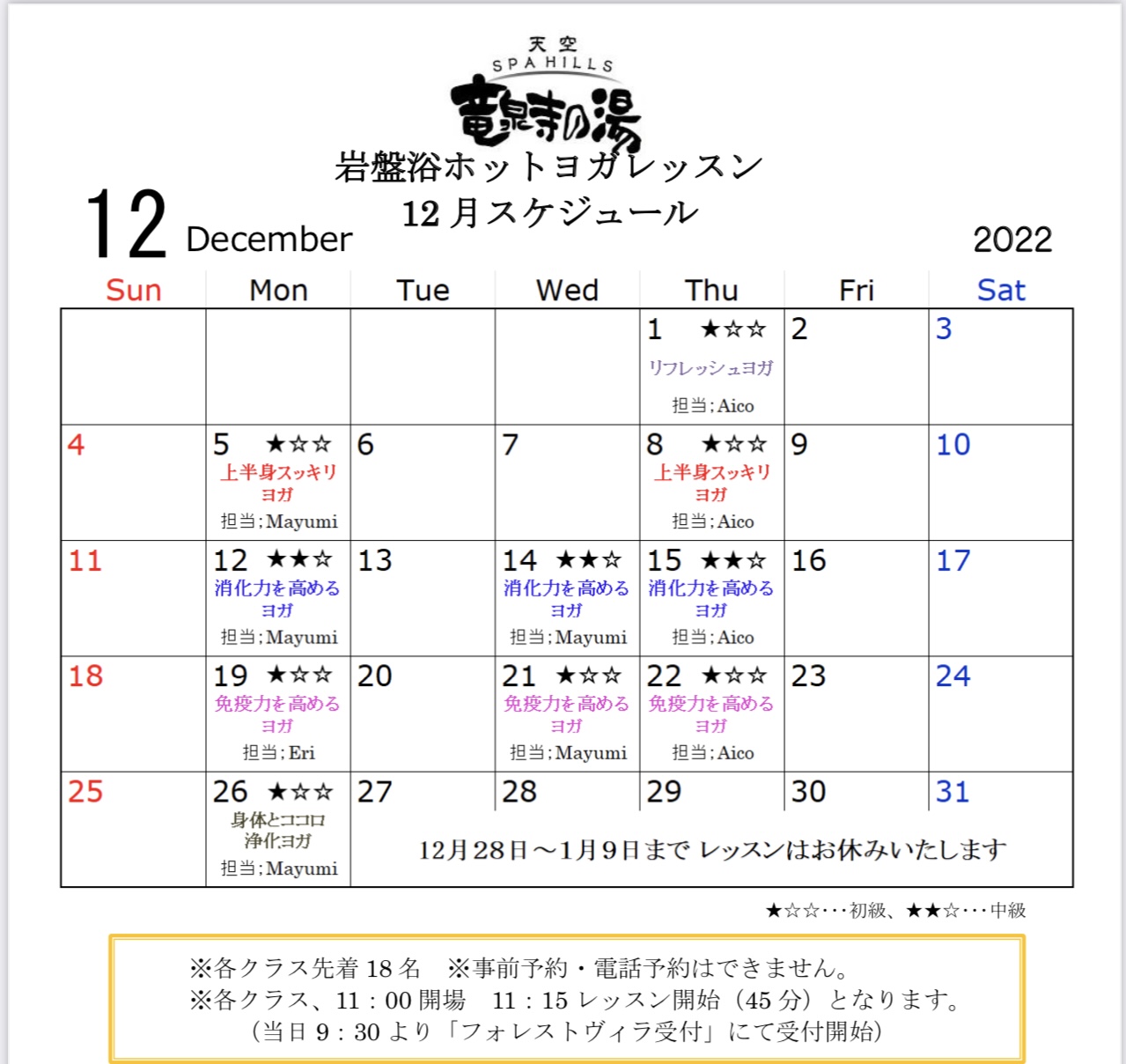 お知らせ Information 2022年11月20日 休館日のお知らせ 12月6日(火) 12月7日(水)の2日間、 設備点検及びメンテナンスのため、休館日とさせていただきます。 大変ご迷惑をお掛け致しますが、ご理解のほどよろしくお願い致します。 2022年11月18日 【ヨガレッスンスケジュール】 【12月のヨガレッスンのスケジュール】 こちらをご確認の上ご参加くださいませ。 ※参加費500円 ※岩盤浴ご利用の方限定となります 2022年11月15日 Ryusenji no Yu✖矢場とんコラボグッズ期間限定ストア開催! 竜泉寺の湯名古屋守山本店では、名古屋名物みそかつ「矢場とん」さんとのコラボキャンペーンが開催中です! 販売期間11月15日(火)~12月28日(水) 【コラボグッズ販売】 サウナーには必需品のサウナハットは、耳がしっか […] 2022年10月25日 Ryusennji no Yu POP UP STORE JR名古屋駅直結 タカシマヤ ゲートタワーモールでは、2022年10月26日(水)~11月1日(火)の期間限定で、Ryusennji no Yu POP UP STORE開催します。 新作のポンチョやオロポサウナハットな […] 2022年10月21日 【ヨガレッスンスケジュール】 【11月のヨガレッスンのスケジュール】 こちらをご確認の上ご参加くださいませ。 ※参加費500円 ※岩盤浴ご利用の方限定となります « 先頭«...10...1819202122...30...»最後 » Follow us