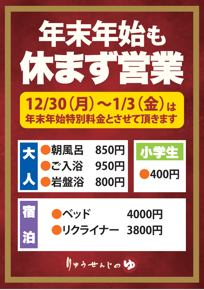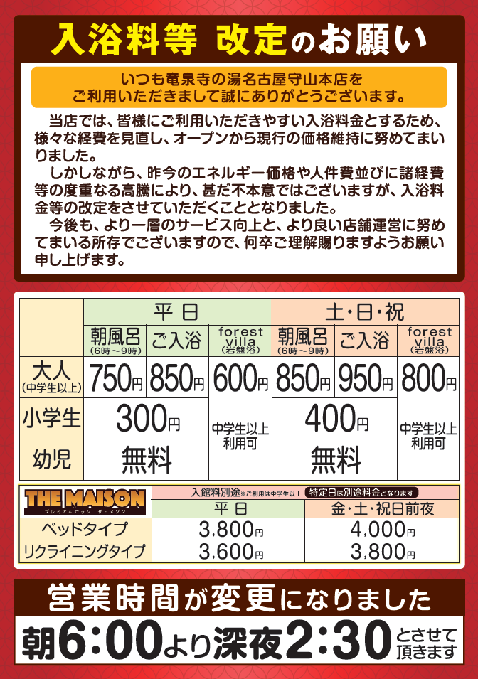 お知らせ Information 2025年1月16日 「スーパー銭湯発祥の地」竜泉寺の湯サウナサミット~TechGALA前夜の集い~ 2月3日イベント開催のため朝6時~17時まで フォレストビラを、ご利用頂くことが出来なくなっております。 何卒ご了承下さいませ。 2025年1月16日 【ヨガレッスンスケジュール】 【2025年2月のヨガレッスンのスケジュール】 こちらをご確認の上ご参加くださいませ。 ※参加費500円 ※岩盤浴ご利用の方限定となります 2024年12月28日 【年末年始料金のご案内】 【年末年始営業のご案内】 2024年12/30(月)〜2025年1/3(金) までの期間中『特別料金』とさせていただきます。 ・大人入館料 950円 ・朝風呂 850円 ・岩盤浴 800円 ・小学生 400円 ・宿泊ベッ […] 2024年12月24日 【14のグレードアップで更なる極上スパ&サウナへ進化!!】 2024年12月23日 【料金改定のお知らせ】 いつも竜泉寺の湯名古屋守山本店をご利用いただきまして誠にありがとうございます。 当店では、皆様にご利用いただきやすい入浴料金とするため、様々な経費を見直し、オープンから現行の価格維持に努めてまいりました。 しかしながら、 […] « 先頭«...678910...2030...»最後 » Follow us