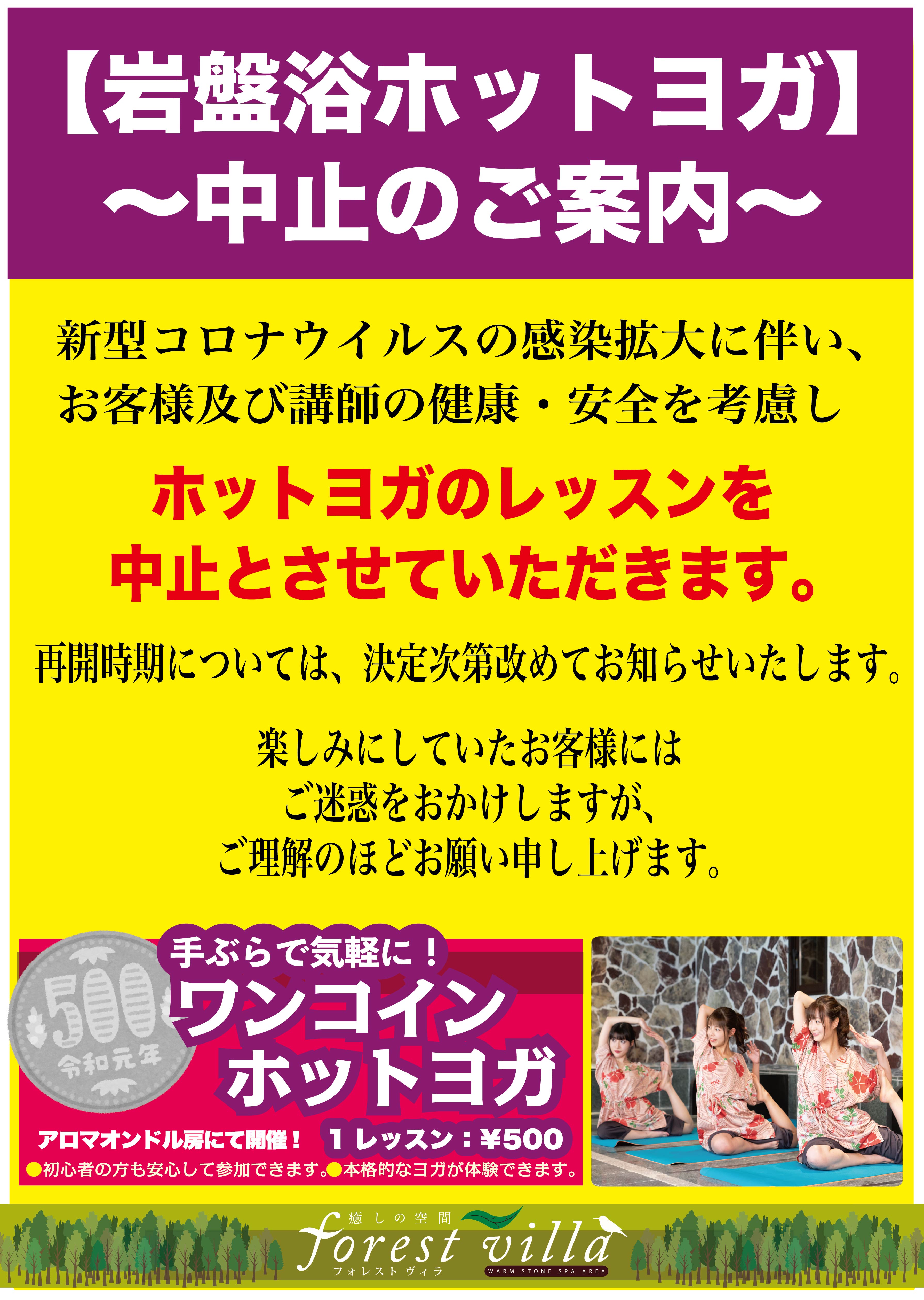 お知らせ Information 岩盤浴ホットヨガ中止のお知らせ 新型コロナウィルスの影響により、 ホットヨガレッスンは当面自粛(中止)させて頂きます。 何卒、ご理解の程、宜しくお願い申し上げます。 2020年3月3日 一覧に戻る