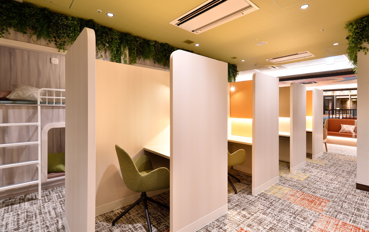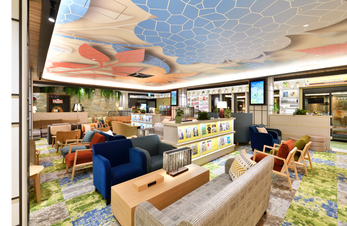 広がるラウンジエリア、色とりどりの